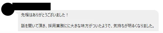 話を聞いて頂き、採用業務に大きな味方がついたようで、気持ちが明るくなりました。 -
