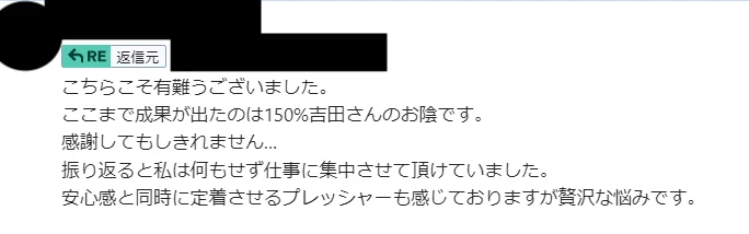 こちらこそ有難うございました。ここまで成果が出たのは150%吉田さんのお陰です。
