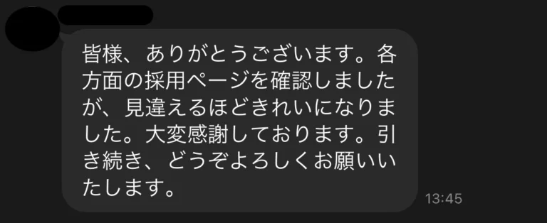 皆様、ありがとうございます。各方面の採用ページを確認しましたが、見違えるほどきれいになりました。大変感謝しております。引き続き、どうぞよろしくお願いいたします。 -