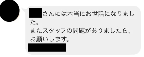 **さんには本当にお世話になりました。またスタッフの問題がありましたら、お願いします。 -