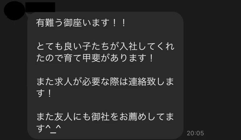 有難う御座います!!とても良い子たちが入社してくれたので育て甲斐があります!また求人が必要な際は連絡致します!