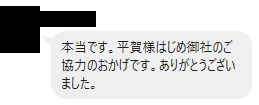 本当です。平賀様はじめ御社のご協力のおかげです。ありがとうございました。 -