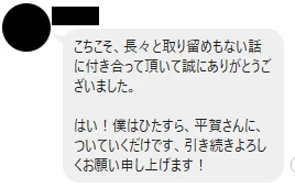 はい!僕はひたすら、平賀さんに、ついていくだけです。引き続きよろしくお願い申し上げます。 -