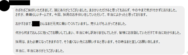 さすが、素晴らしいチームです。今回、採用のお手伝いをしていただいて、本当によかったと思っております。